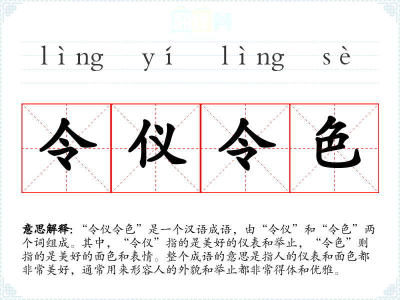 “令仪令色”是一个汉语成语,由“令仪”和“令色”两个词组成。其中,“令仪”指的是美好的仪表和举止,“令色”则指的是美好的面色和表情。整个成语的意思是指人的仪表和面色都非常美好,通常用来形容人的外貌和举止都非常得体和优雅。