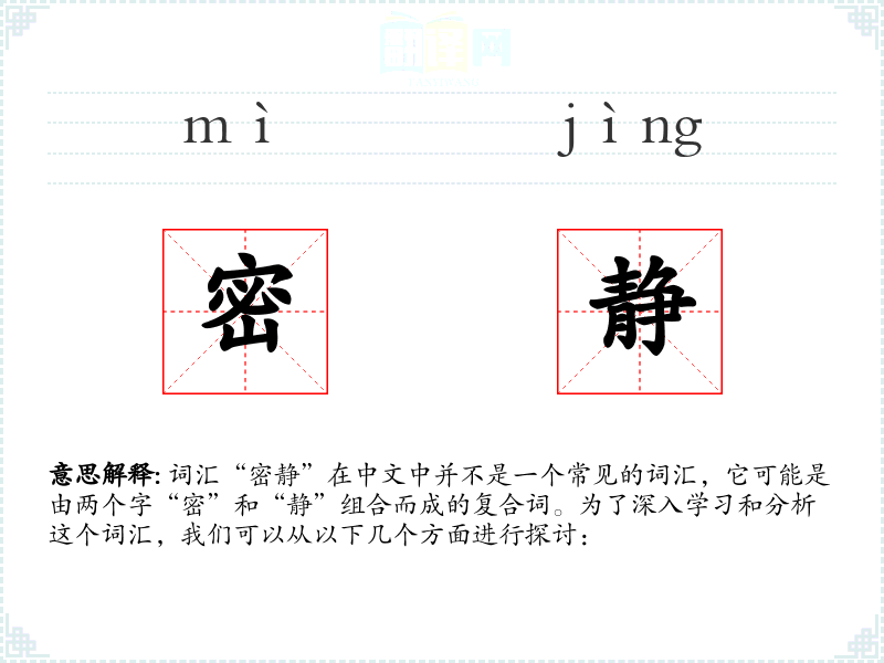 词汇“密静”在中文中并不是一个常见的词汇,它可能是由两个字“密”和“静”组合而成的复合词。为了深入学习和分析这个词汇,我们可以从以下几个方面进行探讨: