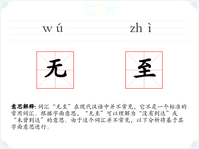 词汇“无至”在现代汉语中并不常见,它不是一个标准的常用词汇。根据字面意思,“无至”可以理解为“没有到达”或“未曾到达”的意思。由于这个词汇并不常见,以下分析将基于其字面意思进行。