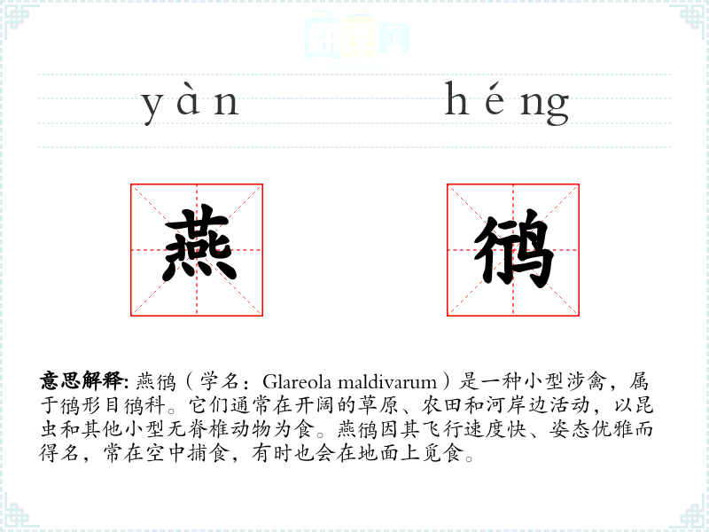 燕鸻的名称来源于其飞行*性,类似于燕子,而“鸻”则是指一类小型涉禽。这个词在中文中的使用历史较长,主要在鸟类学和生态学领域中使用。