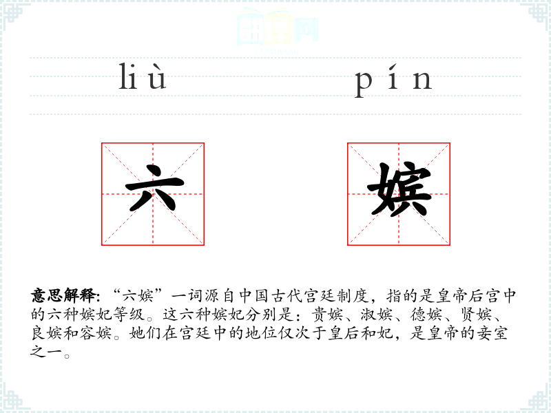 同义词“嫔妃”和“后宫佳丽”都指代的妾室,但“六嫔”特指那六种等级的嫔妃。反义词“皇后”和“正室”则指的正妻,地位高于六嫔。