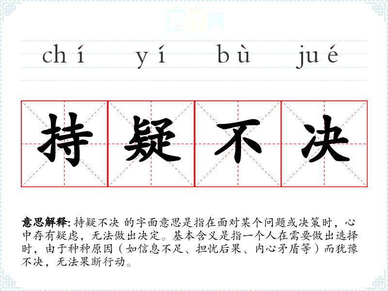 持疑不决 是由“持疑”和“不决”两个词组合而成,其中“持疑”意味着持有疑问或不确定,“不决”则表示没有做出决定。这个词组在中文中的使用历史较长,但其具体起源难以追溯。