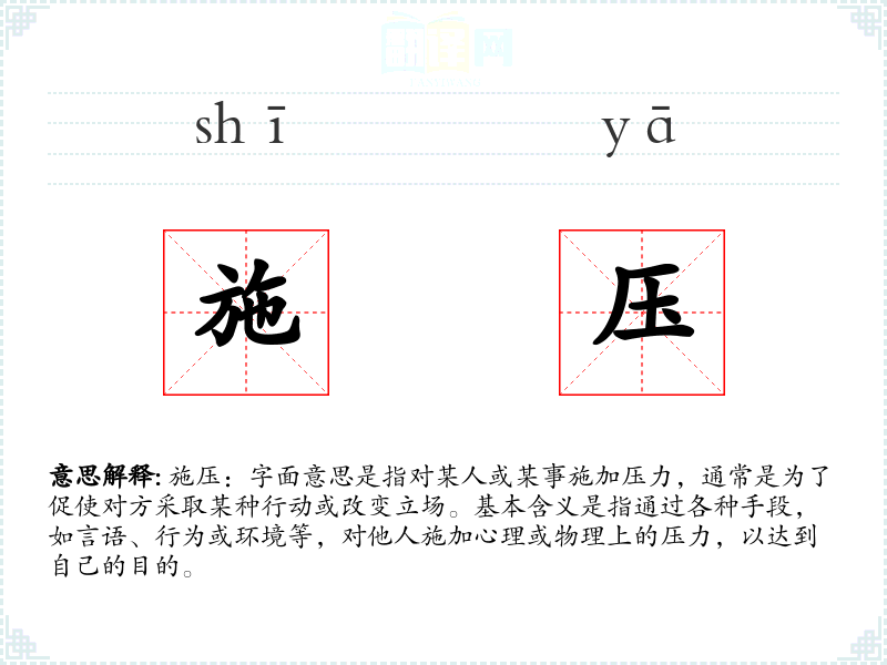 "施压"的意思解释、施压是什么意思由翻译网汉语词典查词提供。