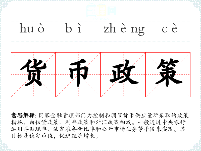 国家金融管理部门为控制和调节货币供应量所采取的政策措施。由信贷政策、利率政策和外汇政策构成。一般通过中央银行运用再贴现率、法定准备金比率和公开市场业务等手段来实现。其目标是稳定币值,促进经济增长。