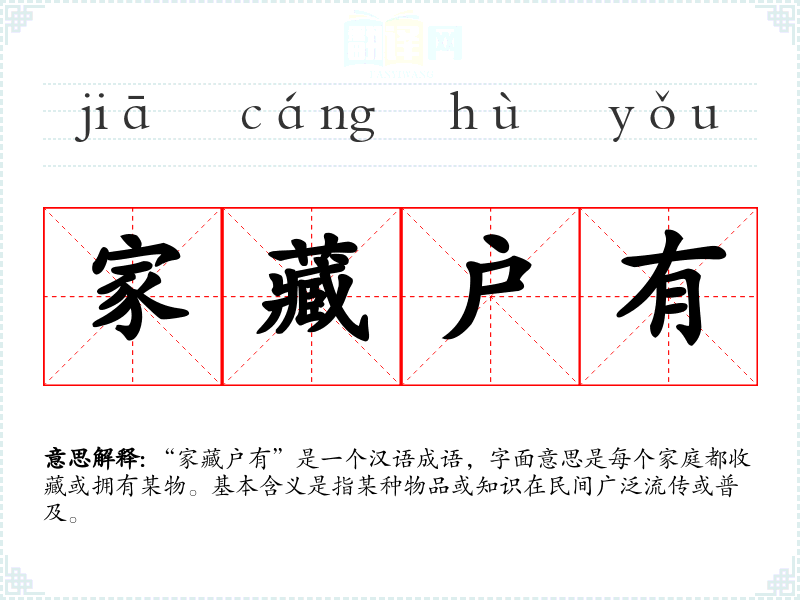 - 文学:在文学作品中,这个成语常用来形容某种文化或物品的普及程度,如“这本书在民间家藏户有,影响深远。”