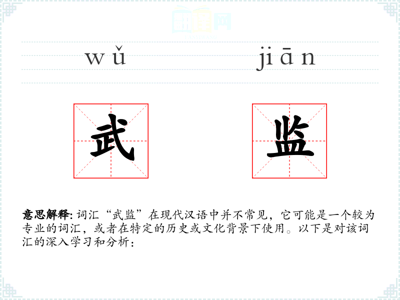 词汇“武监”在现代汉语中并不常见,它可能是一个较为专业的词汇,或者在特定的历史或文化背景下使用。以下是对该词汇的深入学*和分析: