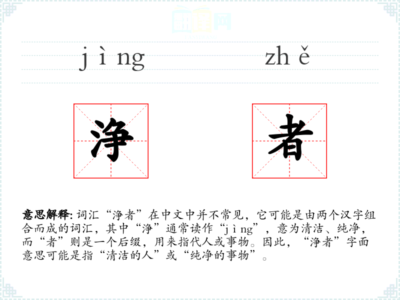 - 词源:“浄”源自古代汉语,意为清洁、纯净,而“者”作为后缀,古已有之。