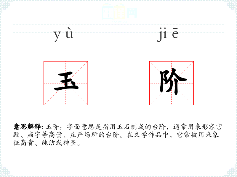 玉阶:字面意思是指用玉石制成的台阶,通常用来形容宫殿、庙宇等高贵、庄严场所的台阶。在文学作品中,它常被用来象征高贵、纯洁或神圣。