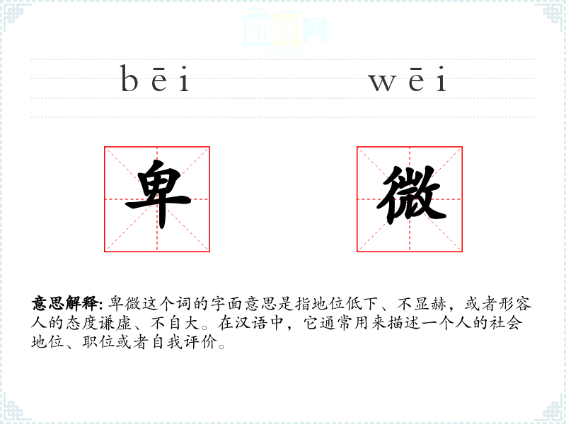 卑微这个词的字面意思是指地位低下、不显赫,或者形容人的态度谦虚、不自大。在汉语中,它通常用来描述一个人的社会地位、职位或者自我评价。