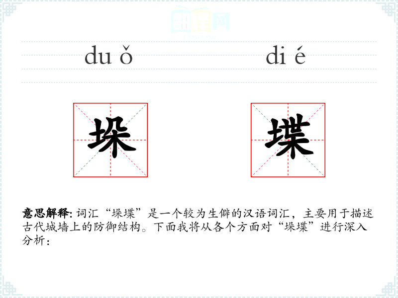 - 专业领域:在建筑学、军事学等领域,垛堞是一个专业术语,用于描述古代城防建筑的特定部分。
