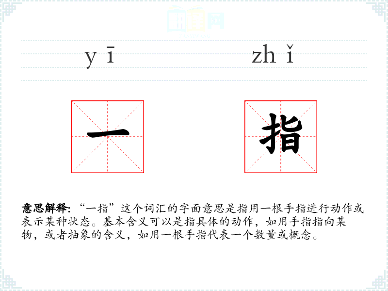 “一指”这个词汇的字面意思是指用一根手指进行动作或表示某种状态。基本含义可以是指具体的动作,如用手指指向某物,或者抽象的含义,如用一根手指代表一个数量或概念。