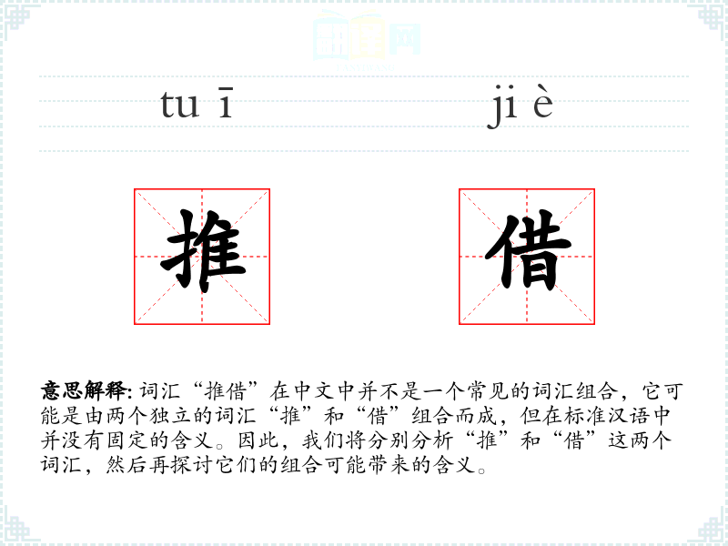 词汇“推借”在中文中并不是一个常见的词汇组合,它可能是由两个独立的词汇“推”和“借”组合而成,但在标准汉语中并没有固定的含义。因此,我们将分别分析“推”和“借”这两个词汇,然后再探讨它们的组合可能带来的含义。