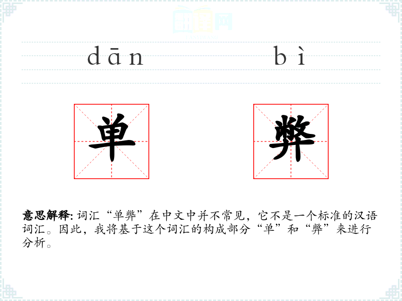 词汇“单弊”在中文中并不常见,它不是一个标准的汉语词汇。因此,我将基于这个词汇的构成部分“单”和“弊”来进行分析。