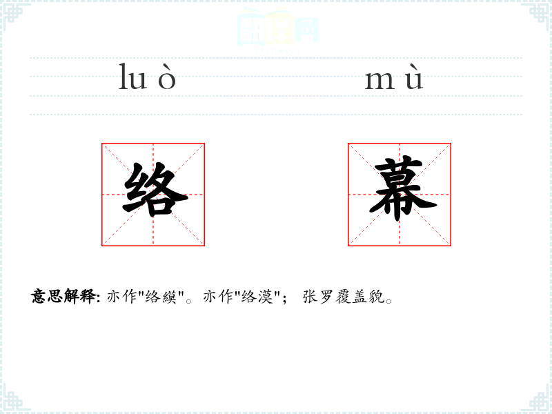 亦作"络縸"。亦作"络漠"; 张罗覆盖貌。