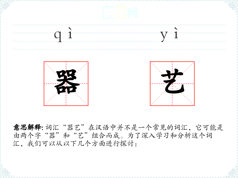 词汇“器艺”在汉语中并不是一个常见的词汇,它可能是由两个字“器”和“艺”组合而成。为了深入学*和分析这个词汇,我们可以从以下几个方面进行探讨: