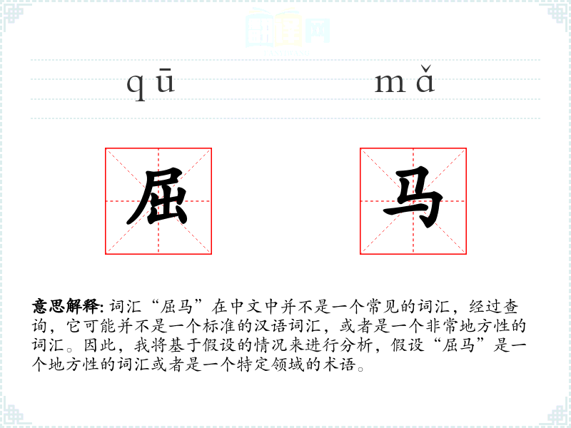词汇“屈马”在中文中并不是一个常见的词汇,经过查询,它可能并不是一个标准的汉语词汇,或者是一个非常地方性的词汇。因此,我将基于假设的情况来进行分析,假设“屈马”是一个地方性的词汇或者是一个特定领域的术语。