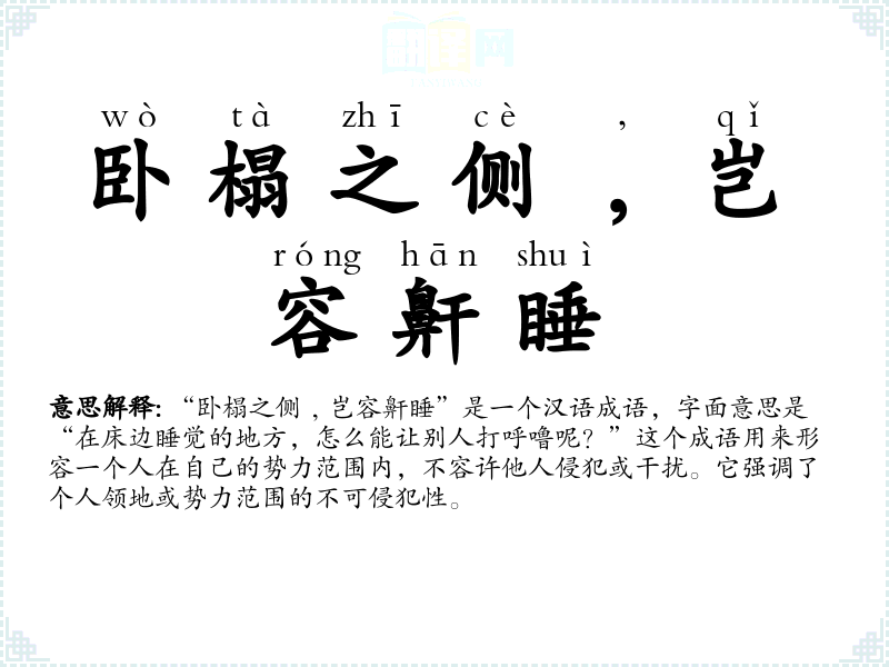 - wò tà zhī shàng,qǐ róng tā rén hān shuì卧榻之上,岂容他人鼾睡