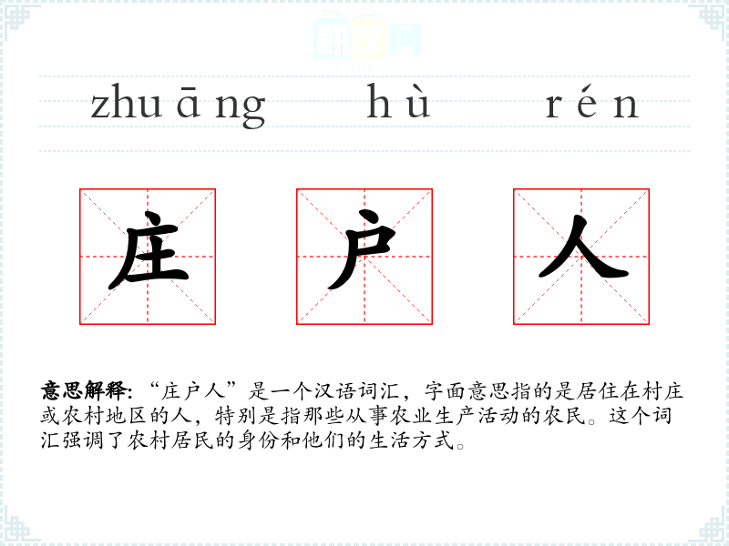 “庄户人”是一个汉语词汇,字面意思指的是居住在村庄或农村地区的人,特别是指那些从事农业生产活动的农民。这个词汇强调了农村居民的身份和他们的生活方式。