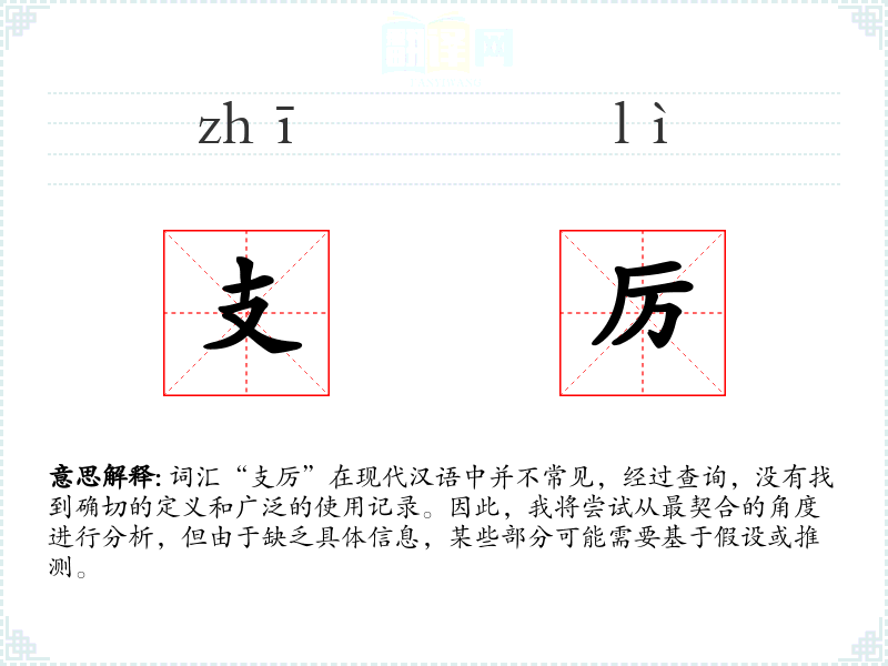 词汇“支厉”在现代汉语中并不常见,经过查询,没有找到确切的定义和广泛的使用记录。因此,我将尝试从最契合的角度进行分析,但由于缺乏具体信息,某些部分可能需要基于假设或推测。