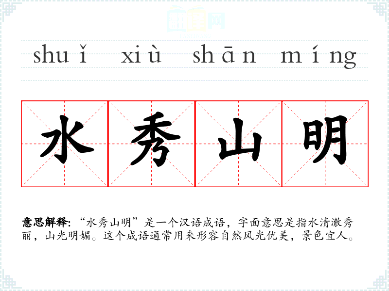 “水秀山明”是一个汉语成语,字面意思是指水清澈秀丽,山光明媚。这个成语通常用来形容自然风光优美,景色宜人。