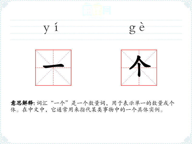 词汇“一个”是一个数量词,用于表示单一的数量或个体。在中文中,它通常用来指代某类事物中的一个具体实例。