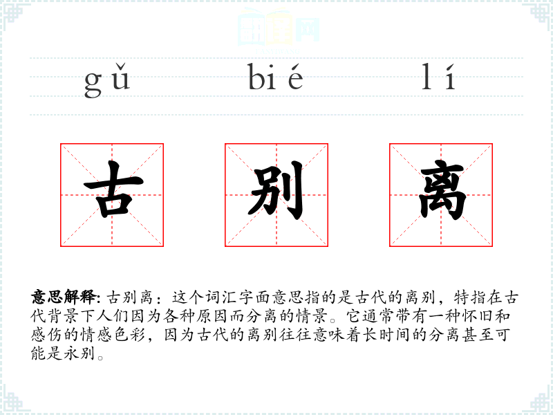 古别离:这个词汇字面意思指的是古代的离别,特指在古代背景下人们因为各种原因而分离的情景。它通常带有一种怀旧和感伤的情感色彩,因为古代的离别往往意味着长时间的分离甚至可能是永别。