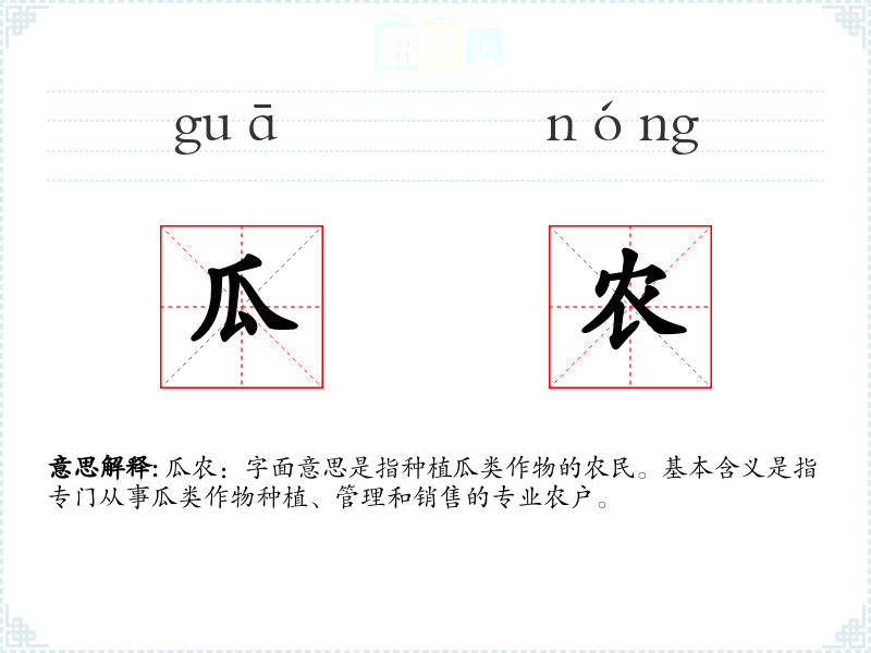 对应词汇:在英语中,瓜农可以对应为“melon farmer”或“gourd grower”。 使用情况:不同文化中,瓜农的形象和职业内容可能有所不同,但都体现了对农业生产的重视和对自然的热爱。