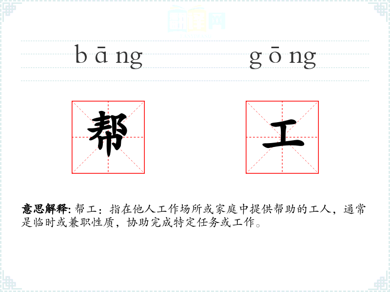 帮工:指在他人工作场所或家庭中提供帮助的工人,通常是临时或兼职性质,协助完成特定任务或工作。