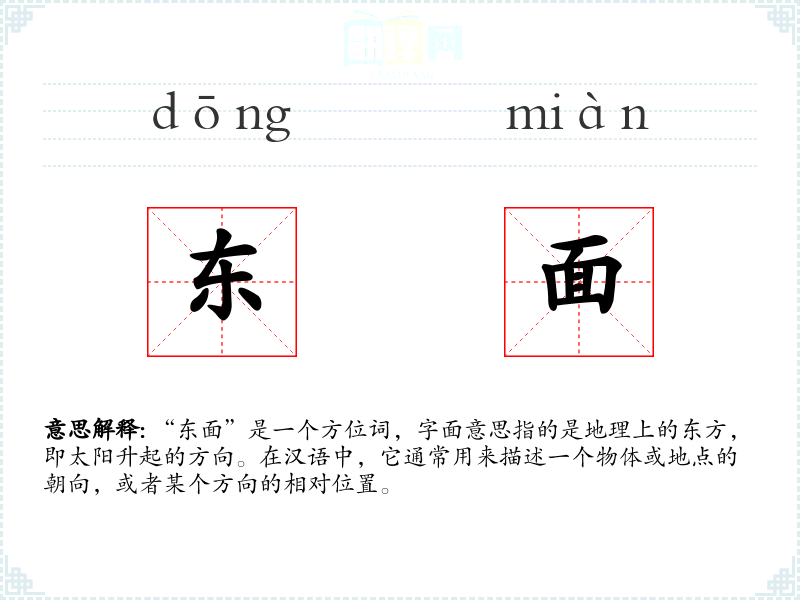 “东面”是一个方位词,字面意思指的是地理上的东方,即太阳升起的方向。在汉语中,它通常用来描述一个物体或地点的朝向,或者某个方向的相对位置。