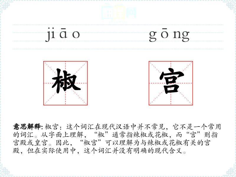 椒宫:这个词汇在现代汉语中并不常见,它不是一个常用的词汇。从字面上理解,“椒”通常指辣椒或花椒,而“宫”则指宫殿或皇宫。因此,“椒宫”可以理解为与辣椒或花椒有关的宫殿,但在实际使用中,这个词汇并没有明确的现代含义。