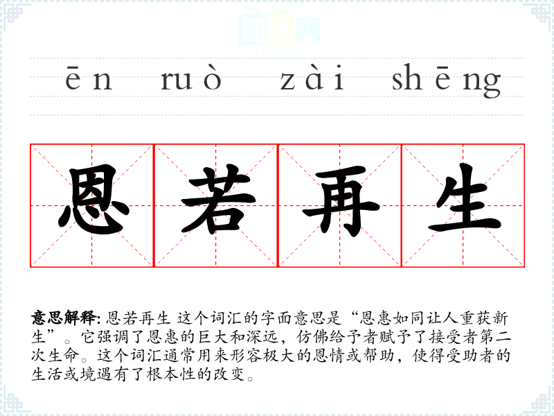 恩若再生 这个词汇的字面意思是“恩惠如同让人重获新生”。它强调了恩惠的巨大和深远,仿佛给予者赋予了接受者第二次生命。这个词汇通常用来形容极大的恩情或帮助,使得受助者的生活或境遇有了根本性的改变。