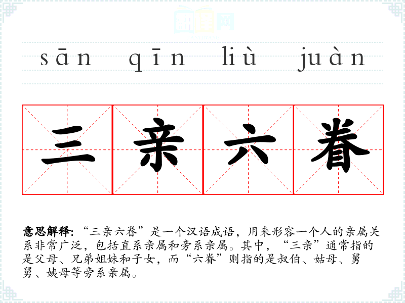 “三亲六眷”是一个汉语成语,用来形容一个人的亲属关系非常广泛,包括直系亲属和旁系亲属。其中,“三亲”通常指的是父母、兄弟姐妹和子女,而“六眷”则指的是叔伯、姑母、舅舅、姨母等旁系亲属。