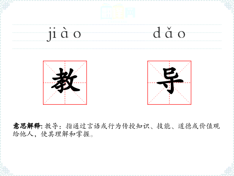 教导:指通过言语或行为传授知识、技能、道德或价值观给他人,使其理解和掌握。