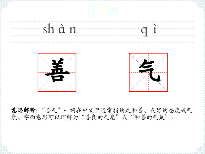 “善气”一词在中文里通常指的是和善、友好的态度或气氛。字面意思可以理解为“善良的气息”或“和善的气氛”。