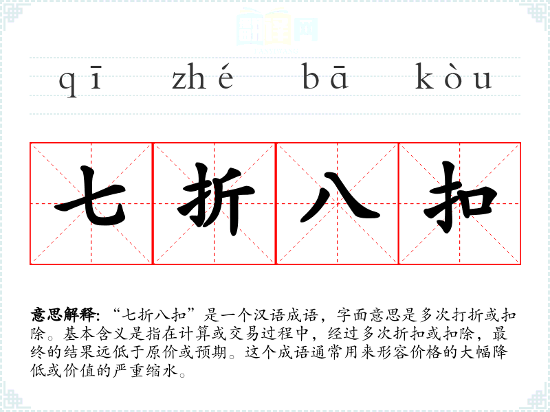 “七折八扣”是一个汉语成语,字面意思是多次打折或扣除。基本含义是指在计算或交易过程中,经过多次折扣或扣除,最终的结果远低于原价或预期。这个成语通常用来形容价格的大幅降低或价值的严重缩水。