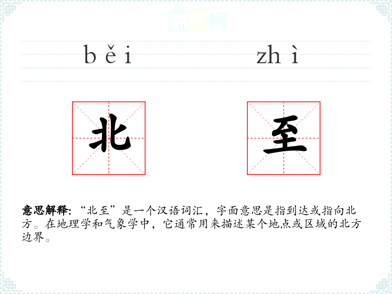 “北至”是一个汉语词汇,字面意思是指到达或指向北方。在地理学和气象学中,它通常用来描述某个地点或区域的北方边界。