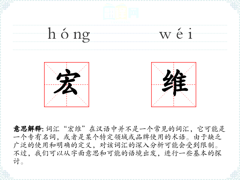 词汇“宏维”在汉语中并不是一个常见的词汇,它可能是一个专有名词,或者是某个特定领域或品牌使用的术语。由于缺乏广泛的使用和明确的定义,对该词汇的深入分析可能会受到限制。不过,我们可以从字面意思和可能的语境出发,进行一些基本的探讨。