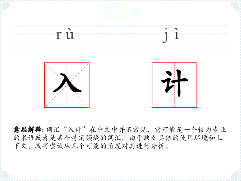 词汇“入计”在中文中并不常见,它可能是一个较为专业的术语或者是某个特定领域的词汇。由于缺乏具体的使用环境和上下文,我将尝试从几个可能的角度对其进行分析。