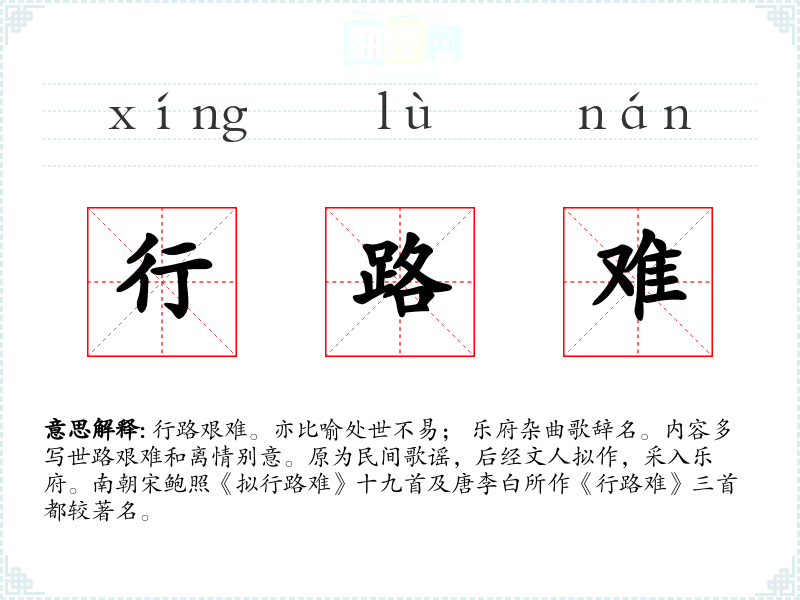 行路艰难。亦比喻处世不易; 乐府杂曲歌辞名。内容多写世路艰难和离情别意。原为民间歌谣,后经文人拟作,采入乐府。南朝宋鲍照《拟行路难》十九首及唐李白所作《行路难》三首都较著名。