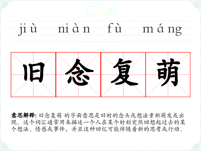 旧念复萌 的字面意思是旧时的念头或想法重新萌发或出现。这个词汇通常用来描述一个人在某个时刻突然回想起过去的某个想法、情感或**,并且这种回忆可能伴随着新的思考或行动。