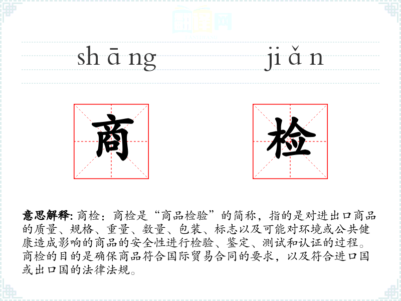 商检:商检是“商品检验”的简称,指的是对进出口商品的质量、规格、重量、数量、包装、标志以及可能对环境或公共健康造成影响的商品的安全性进行检验、鉴定、测试和认证的过程。商检的目的是确保商品符合国际贸易合同的要求,以及符合进口国或出口国的法律法规。
