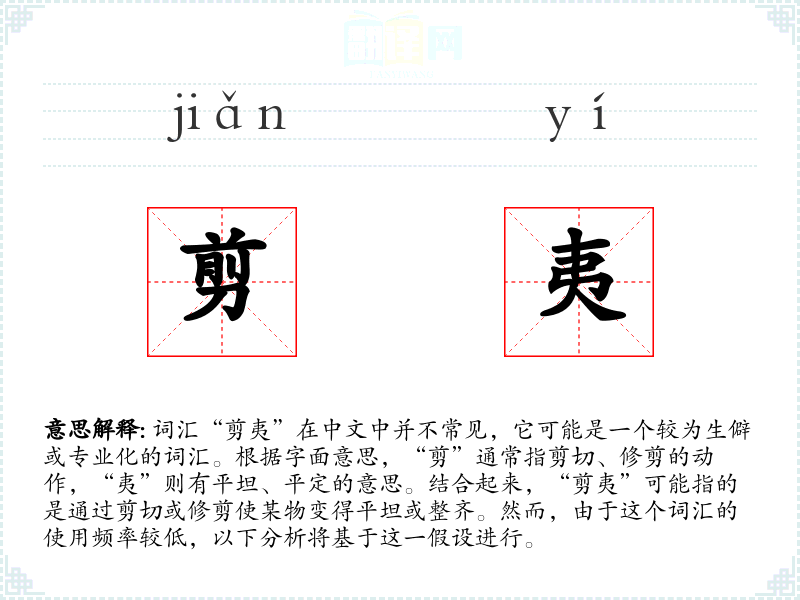 词汇“剪夷”在中文中并不常见,它可能是一个较为生僻或专业化的词汇。根据字面意思,“剪”通常指剪切、修剪的动作,“夷”则有平坦、平定的意思。结合起来,“剪夷”可能指的是通过剪切或修剪使某物变得平坦或整齐。然而,由于这个词汇的使用频率较低,以下分析将基于这一假设进行。