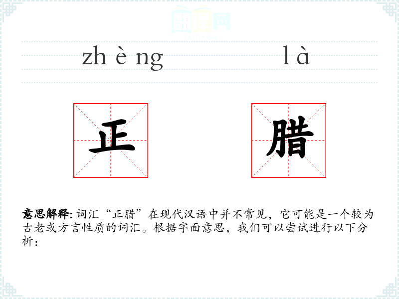 词汇“正腊”在现代汉语中并不常见,它可能是一个较为古老或方言性质的词汇。根据字面意思,我们可以尝试进行以下分析: