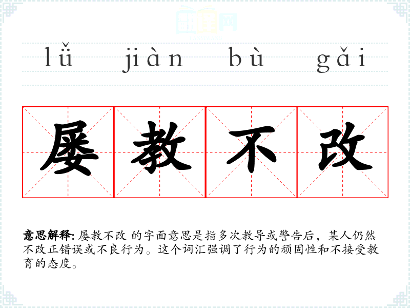 屡教不改 这个词汇在描述顽固性和不接受改变的行为时非常有用。它不仅在语言表达上提供了丰富的情感色彩,也在文化和社会背景中扮演了重要角色。了解和掌握这个词汇,对于深入理解汉语文化和提高语言表达能力都有重要意义。