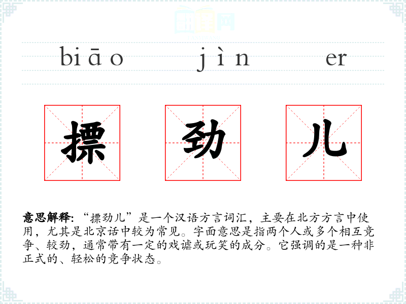 “摽劲儿”是一个汉语方言词汇,主要在北方方言中使用,尤其是北京话中较为常见。字面意思是指两个人或多个相互竞争、较劲,通常带有一定的戏谑或玩笑的成分。它强调的是一种非正式的、轻松的竞争状态。