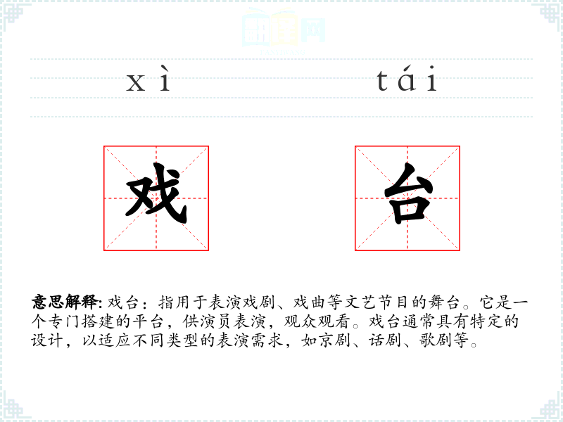 戏台:指用于表演戏剧、戏曲等文艺节目的舞台。它是一个专门搭建的平台,供演员表演,观众观看。戏台通常具有特定的设计,以适应不同类型的表演需求,如京剧、话剧、歌剧等。