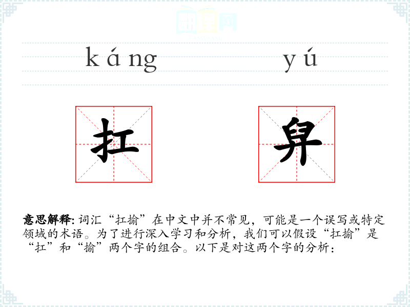 词汇“扛揄”在中文中并不常见,可能是一个误写或特定领域的术语。为了进行深入学习和分析,我们可以假设“扛揄”是“扛”和“揄”两个字的组合。以下是对这两个字的分析: