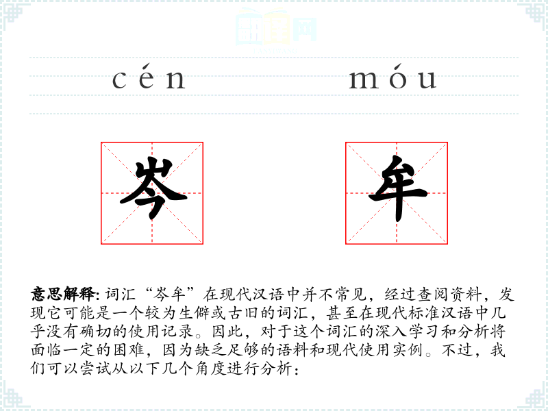 由于“岑牟”在现代汉语中不常见,且缺乏足够的语料和现代使用实例,我们无法对其进行深入的分析和总结。这个词汇可能需要通过历史语言学的方法进行研究,以确定其确切的含义和使用情况。