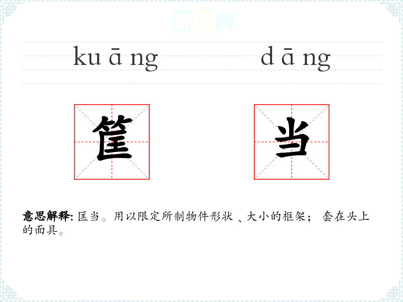 匡当。用以限定所制物件形状﹑大小的框架; 套在头上的面具。