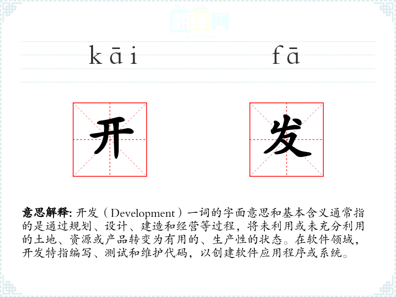 开发(Development)一词的字面意思和基本含义通常指的是通过规划、设计、建造和经营等过程,将未利用或未充分利用的土地、资源或产品转变为有用的、生产性的状态。在软件领域,开发特指编写、测试和维护代码,以创建软件应用程序或系统。